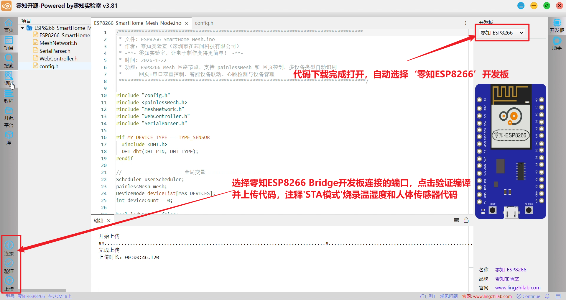 准备3个零知ESP8266开发板,选择 TYPE_LIGHT 节点作为 Bridge,烧录开启ENABLE_BRIDGE_MODE的代码,其他节点(TYPE_SENSOR/TYPE_MOTION)烧录对应的代码