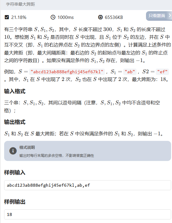 先存储s,s1,s2 然后在s中查找s1,(若不存在,输出-1)若存在,由于要找最大跨距,反转s2与截去s1后的s,在s中查找s2(返回索引pos2),(若不存在,输出-1)若存在,进行简单计算(s.length() - pos2 - s2.length())并输出索引即为最大跨距。