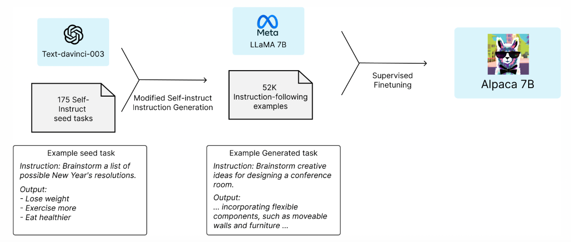 为了进行微调,他们使用了 52k 条指令,并将这些指令输入到text-davinci-003 中以获得输出,然后用这些输出来微调 LLaMa-7B。生成这些指令的成本低于 500 美元。微调的训练过程成本低于 100 美元。参见Stanford Alpaca:一种指令跟踪的 LLaMA 模型(Taori 等人,2023)。