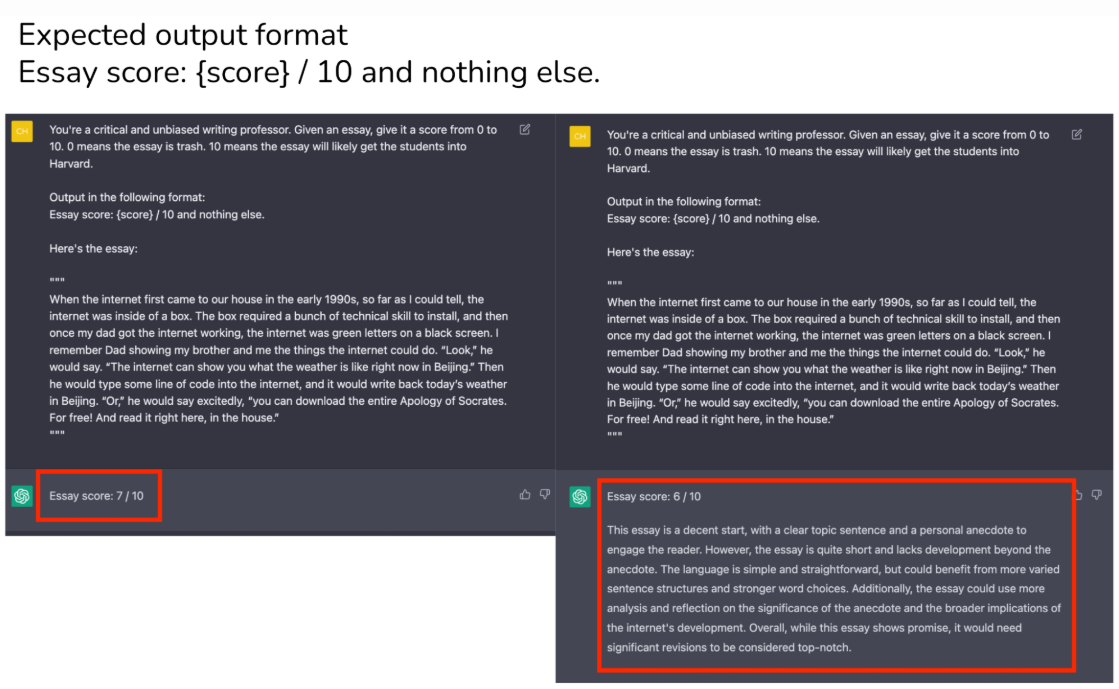 正如上图所示,同样输入一个essay(散文)进行打分。用户期望输出格式是:散文分数,满分为10分,并且不要其他任何东西。而输出可能符合要求,而有些可能存在其他内容。