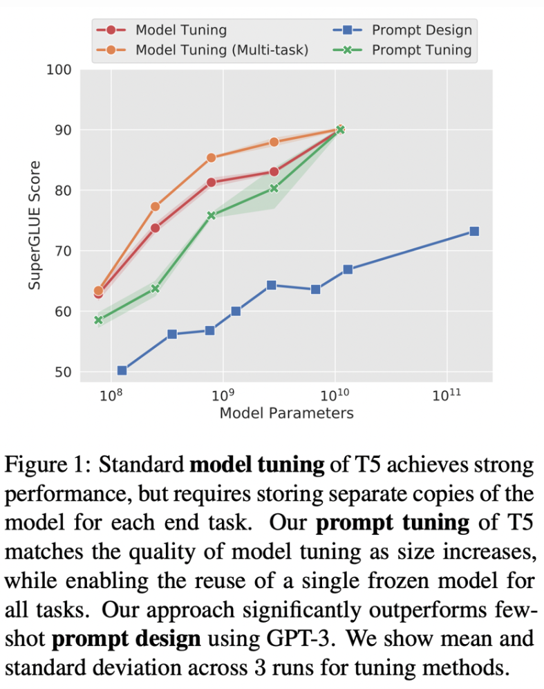 https://arxiv.org/abs/2104.08691介于提示和微调之间的一种巧妙方法,由 Leister 等人于 2021 年提出。该方法从提示开始,但并非直接修改提示本身,而是通过编程方式改变提示的嵌入向量。为了实现提示调优,需要能够将提示的嵌入向量输入到 LLM 模型中,并从中生成词元(token)。目前,这只能在开源 LLM 中实现,OpenAI API 尚不支持。在 T5 数据集上,提示调优的性能似乎远优于提示工程,并且可以赶上模型调优(见下图)。