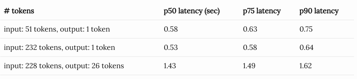即使输入(51 个词元)和输出(1 个词元)都非常短, gpt-3.5-turbo的延迟也约为 500 毫秒。如果输出词元增加到 20 个以上,延迟将超过 1 秒。