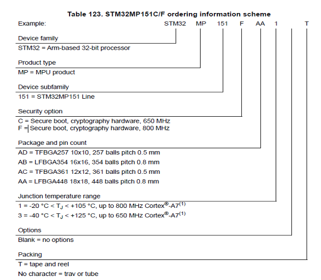 如上图所示,STM32MP15x包含多种型号,只有STM32MP15xC/F系列的芯片才能支持安