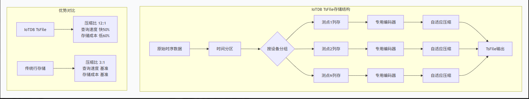 TsFile设计中的一大创新是"时间分区-设备分组-测点列存"的三级组织结构。这种结构使得系统能够快速定位特定时间范围、特定设备的数据,极大提升了查询效率。同时,TsFile支持在文件中直接执行常见聚合操作,避免了不必要的数据读取。