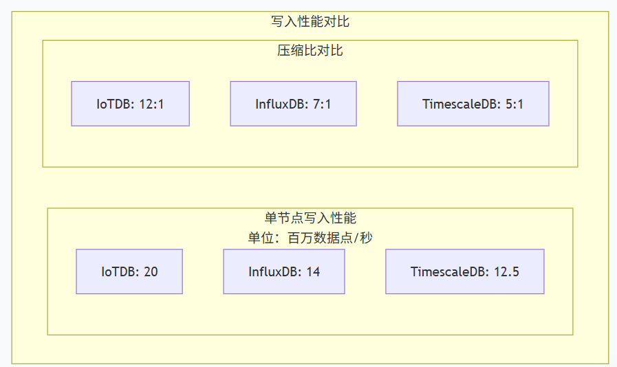 存储效率方面,IoTDB的平均压缩比达到12:1,比对比产品高20-40%。这意味着在存储相同数据量的情况下,IoTDB可节省大量硬件成本。