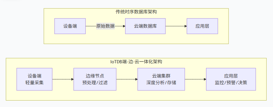 Apache IoTDB采用了一种独特的"端-边-云一体化"架构,这种架构设计充分考虑了大数据在物联网场景中的完整生命周期。与传统时序数据库不同,IoTDB不仅关注云端的数据存储与分析,还专门优化了边缘和端侧的数据处理。