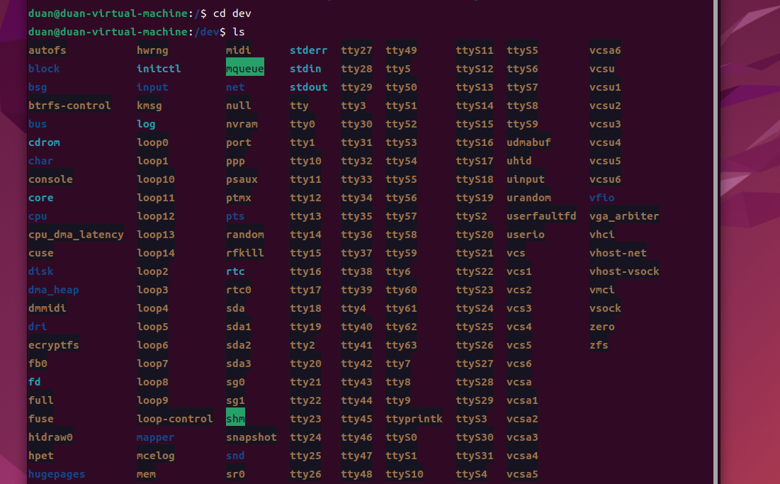 dev 是 device 的缩写,所以此目录下的文件都是和设备有关的,此目录下的文件都是设备文件。在 Linux 下一切皆文件,即使是硬件设备,也是以文件的形式存在的