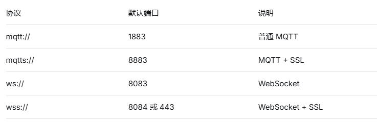 - 开放端口:8083(ws)、8084(wss)、8883(mqtts)