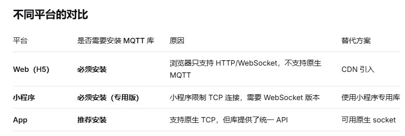 无论是 Web、小程序还是 App,浏览器/移动端都没有内置 MQTT 协议支持,都需要借助 JavaScript 库来实现 MQTT 客户端功能。