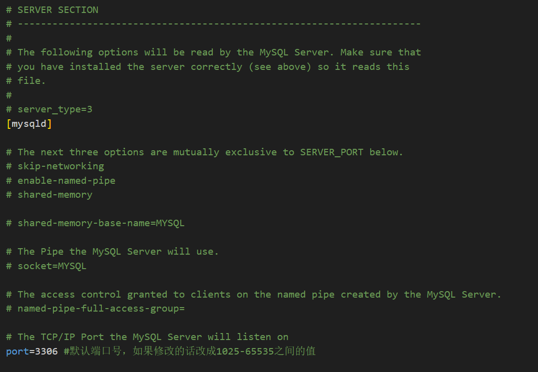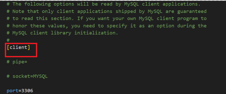 所有客户端程序的配置都在[client]节点下,port=3306,表示端口为3306