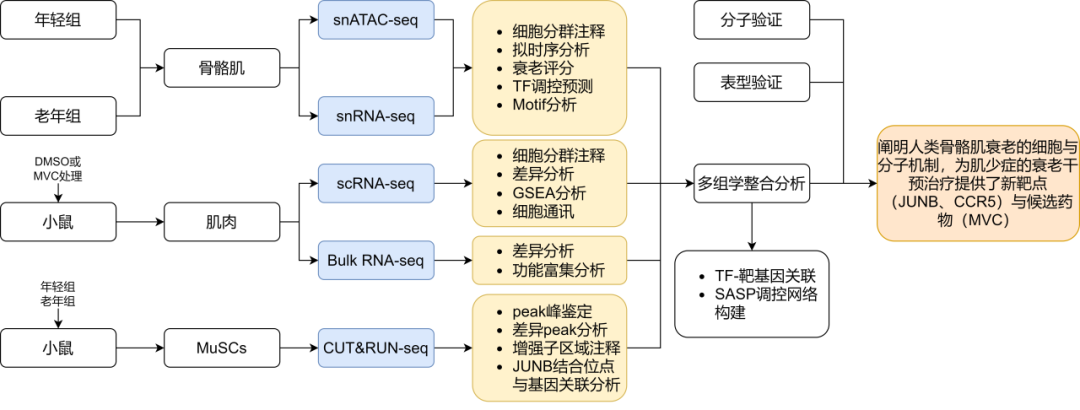 本研究通过snRNA-seq+snATAC-seq、bulk RNA-seq 及CUT&RUN-seq等多组学技术,首次绘制了人类骨骼肌衰老的细胞衰老图谱,明确12种细胞中,老年组MuSCs、FAPs、内皮细胞及平滑肌细胞的衰老比例显著升高;拟时序分析进一步揭示了不同细胞类型的衰老动态轨迹;同时解析了衰老相关分泌表型(SASP)的异质性特征;通过细胞通讯分析发现老年组SASP介导的细胞互作强度增强;此外,作者证实CCR5拮抗剂Maraviroc(MVC)可作为有效的衰老干预药物;还通过CUT&RUN-seq等技术明确AP-1家族转录因子JUNB是SASP激活的核心调控因子。综上,该研究阐明了人类骨骼肌衰老的细胞与分子机制,为肌少症的衰老干预治疗提供了新靶点(JUNB、CCR5)与候选药物(MVC)。