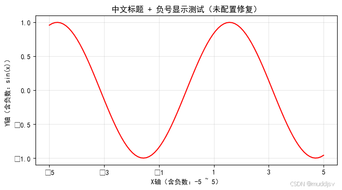 ax.set_title('中文标题 + 负号显示测试(未配置修复)')