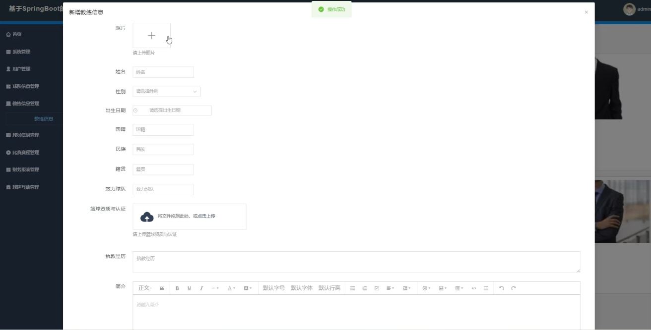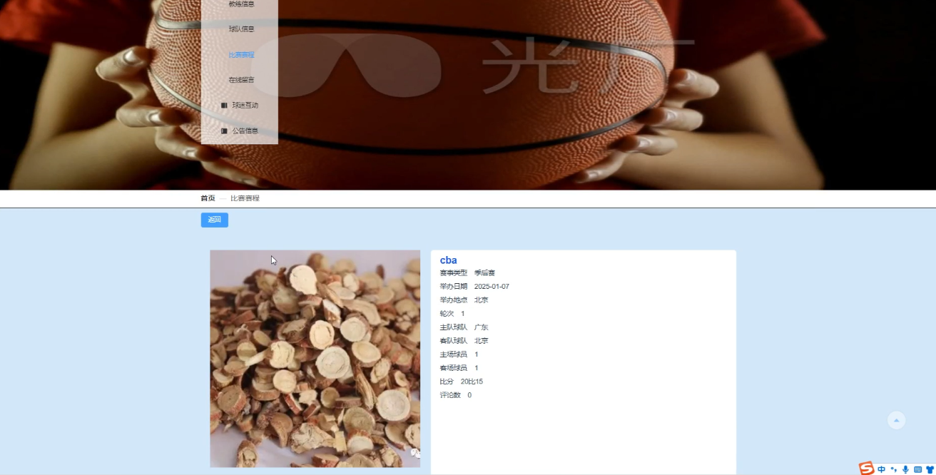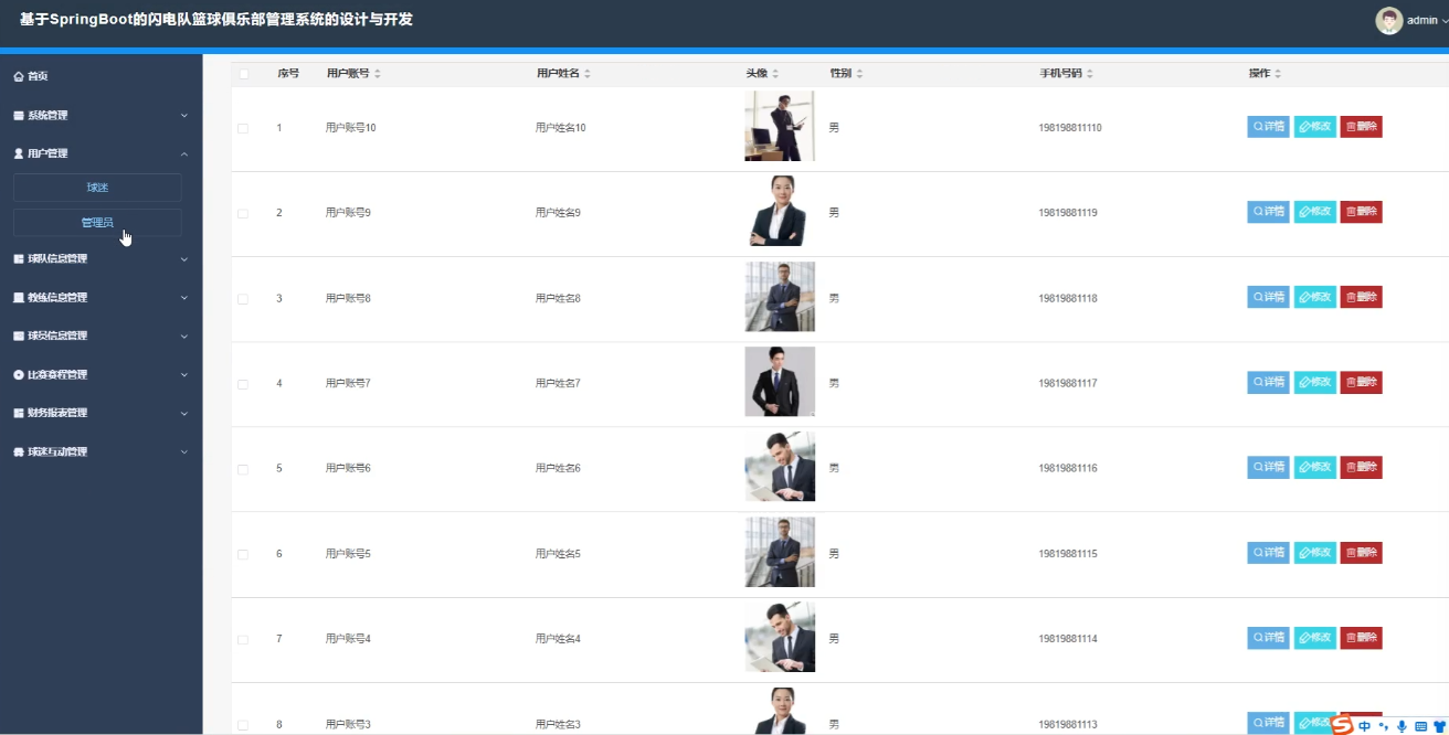 核心涵盖系统管理、用户管理、球队信息管理、教练信息管理、球员信息管理、比赛赛程管理、财务报表管理、球迷互动管理八大模块。其中,系统管理支持轮播图更新、公告发布及在线留言管理;用户管理可对球迷信息进行增删改查,同时配置管理员权限;球队、教练、球员信息管理支持对应资料的全流程维护(增删改查)与搜索;比赛赛程管理可录入、修改赛事信息(名称、时间、地点、比分等)并查看评论;同步实现财务报表记录与球迷互动内容管控。