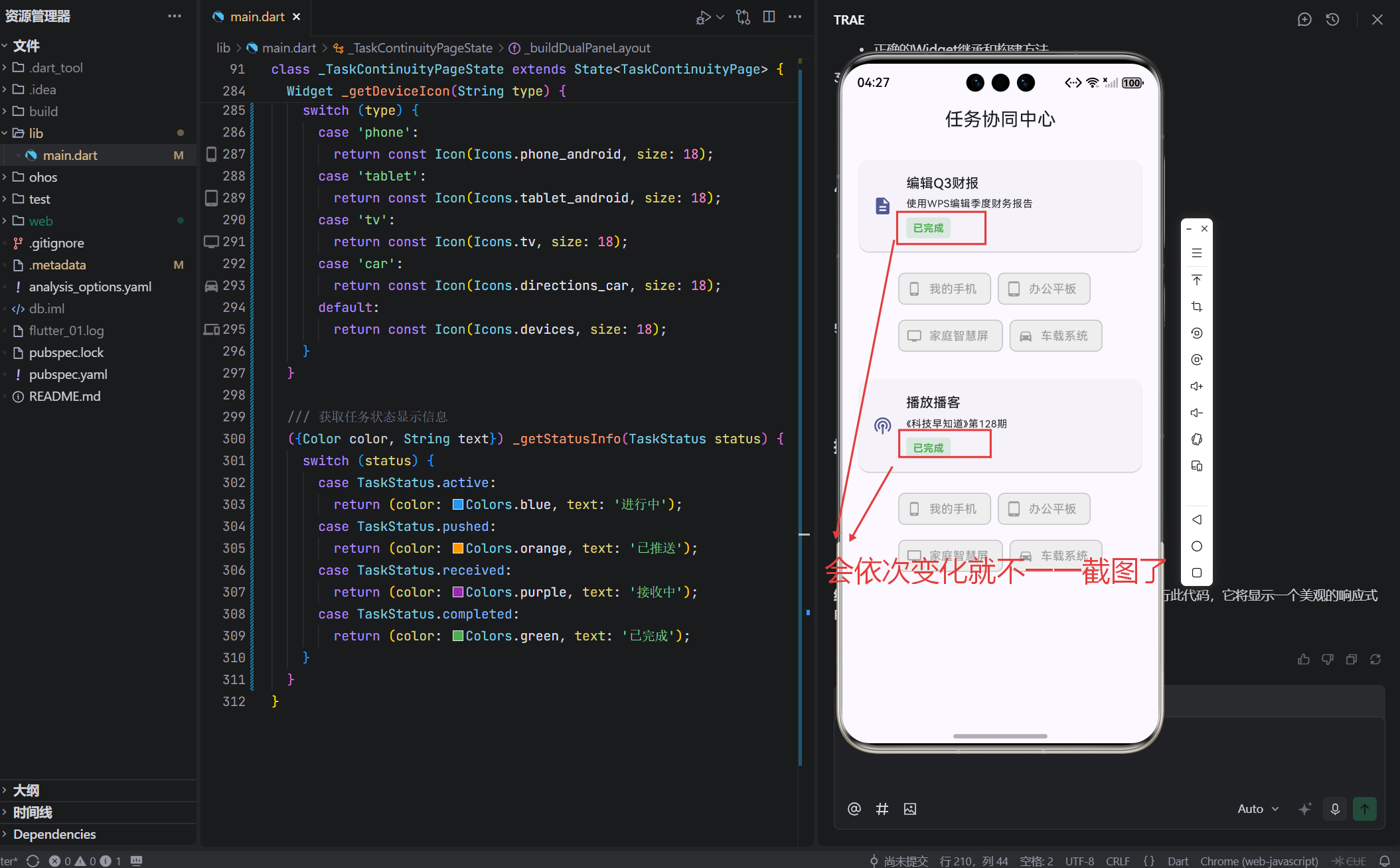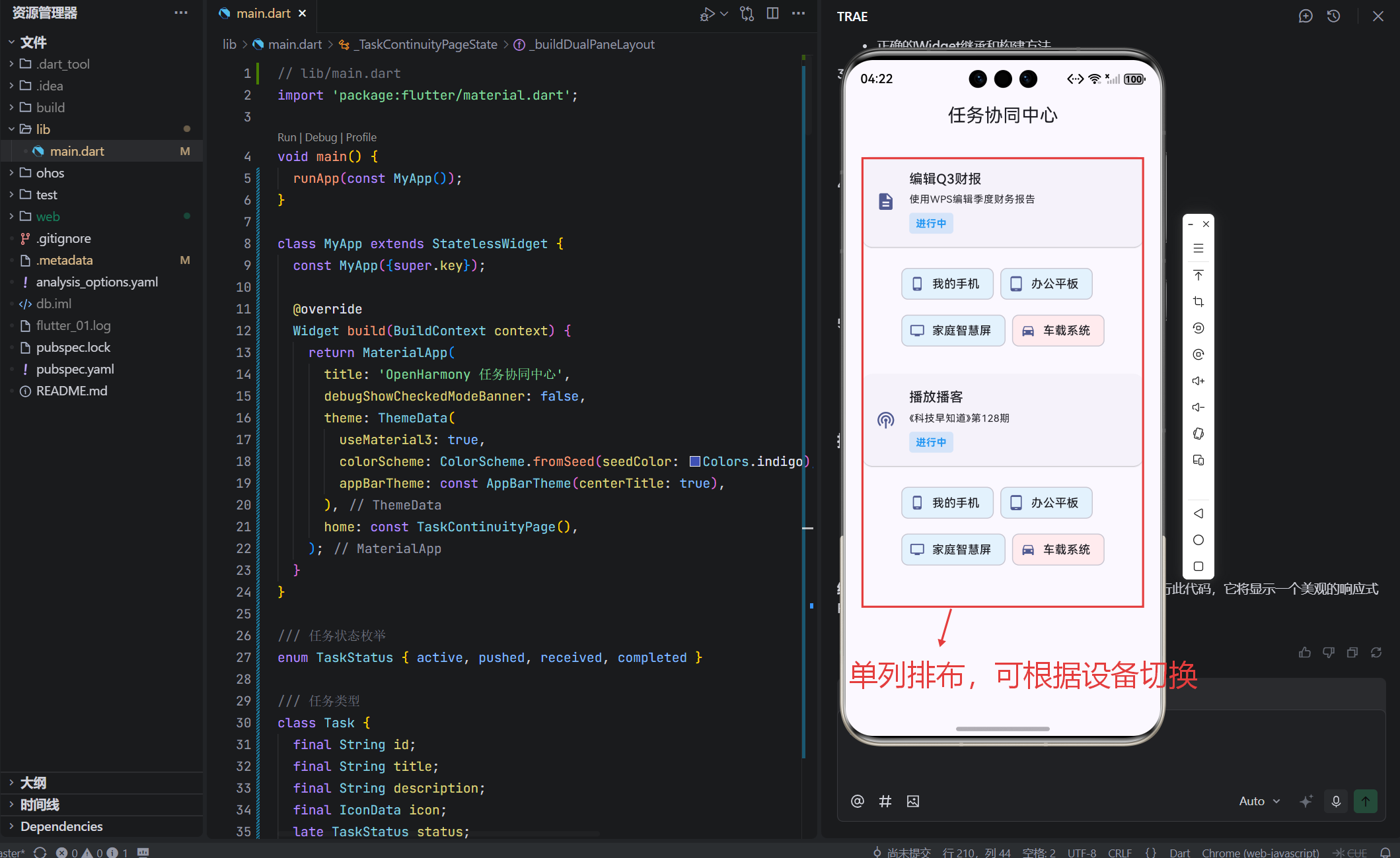 _pushTaskTo中的Future.delayed替换为:dartfinal result = await MethodChannel('ohos/distributed_task').invokeMethod( 'pushTask', {'taskId': task.id, 'targetDeviceId': device.id}, ); -