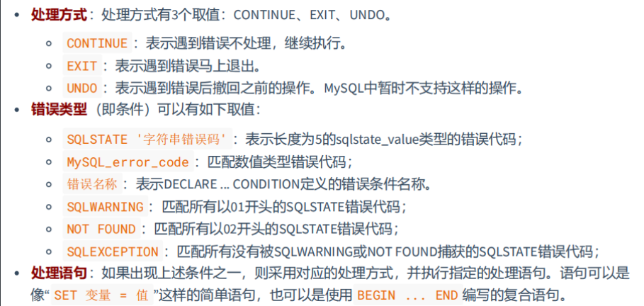 #格式:DECLARE 处理方式 HANDLER FOR 错误类型 处理语句