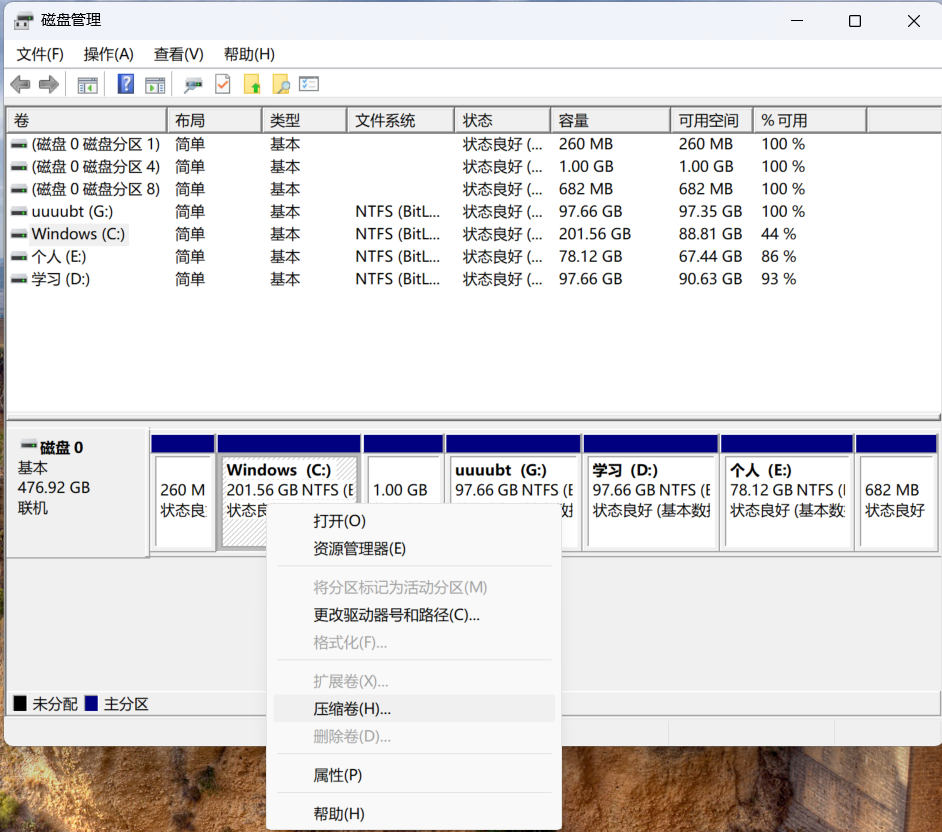 压缩卷:缩小磁盘内存容量。