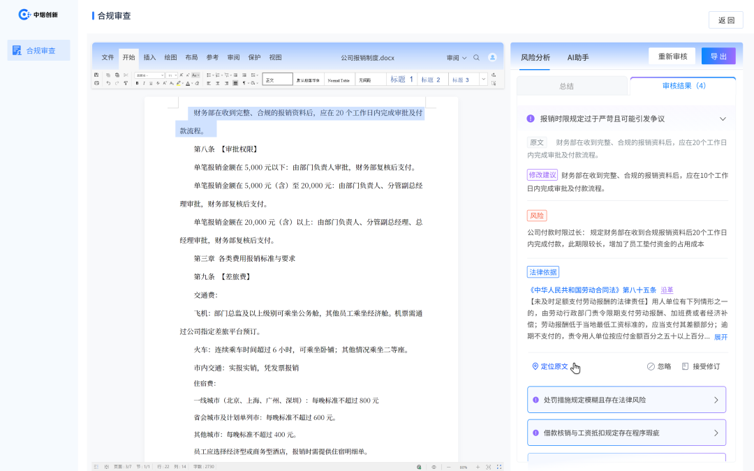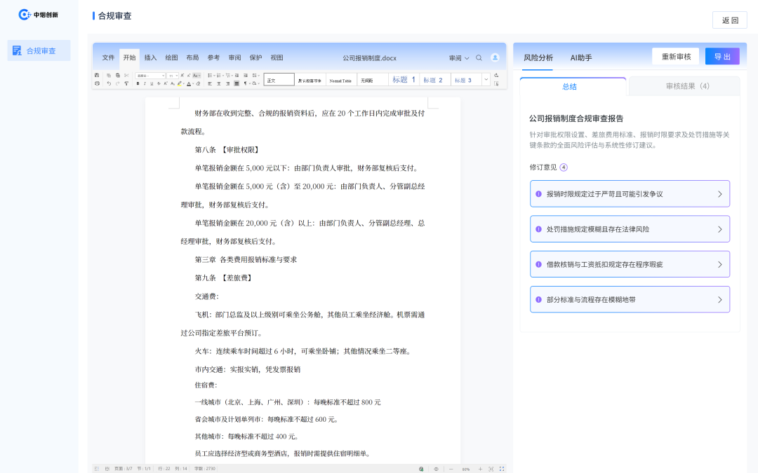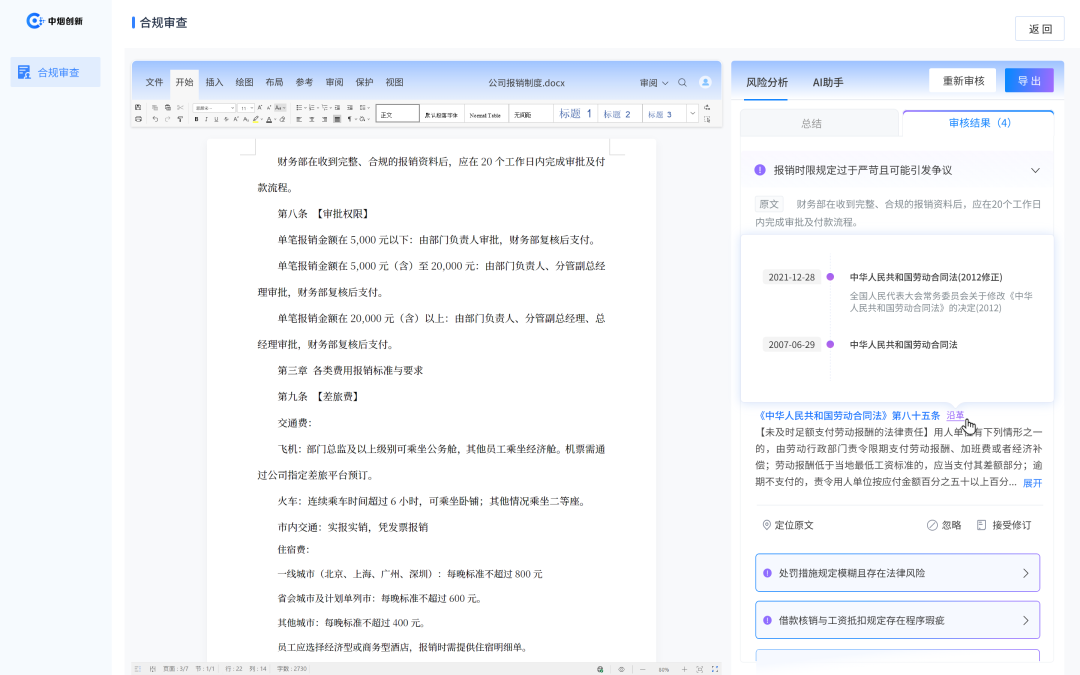 AI助手使合规审查从周期性活动转变为持续过程 ,企业可以随时对新制度草案进行审查,也可以定期对现有制度进行复审,确保制度体系始终与最新的监管要求保持一致。