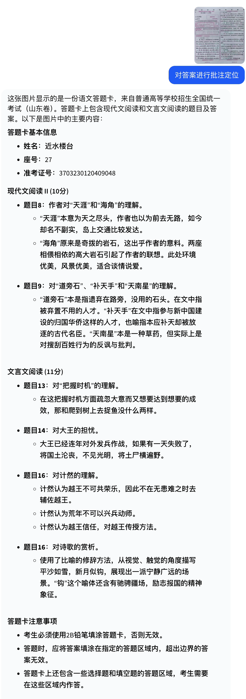 在试卷和手写作业场景中,模型可以识别学生的手写答案并进行区域定位,减少人工框选和标注的工作量。老师只需在结果基础上进行简单核对,而无需逐项手动处理,有助于提升批改效率。
