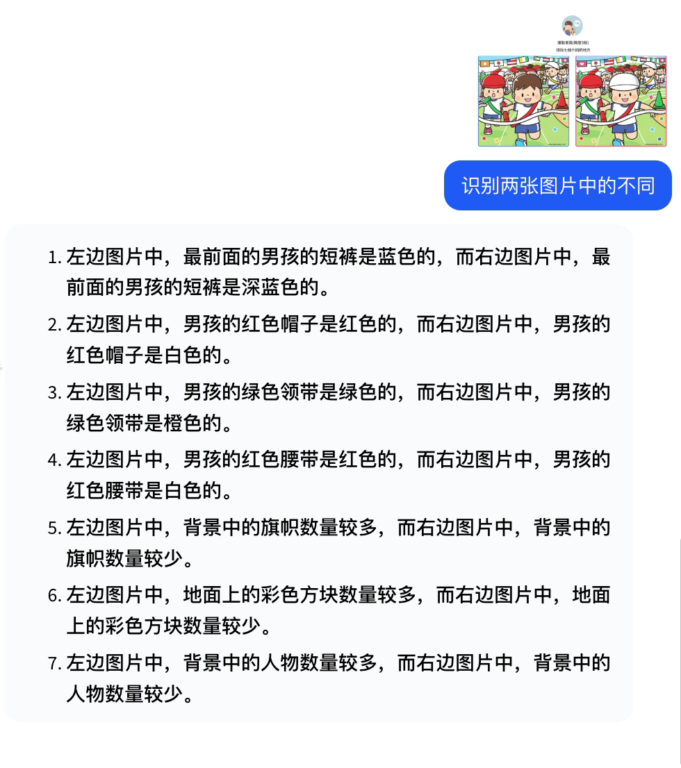 **接着我们测试了图片差异识别能力:**给模型两张内容高度相似的图片,看看它能否把所有不同点都找出来。这类任务对视觉细节的把握要求很高,一旦定位不准,就很容易漏掉关键差异。
