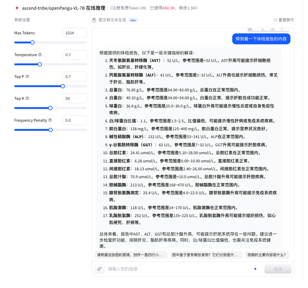 综合多项在线测试结果,openPangu-VL-7B 在图像识别与多模态理解任务中表现稳定。无论是手写内容识别、图像差异判断,还是对体检报告等复杂文档的分析,模型都能够准确提取关键信息,并给出结构清晰、逻辑一致的输出结果。整体来看,该模型在多模态理解的准确性、稳定性和工程可用性方面具备较好的表现,适合在实际业务场景中长期使用。