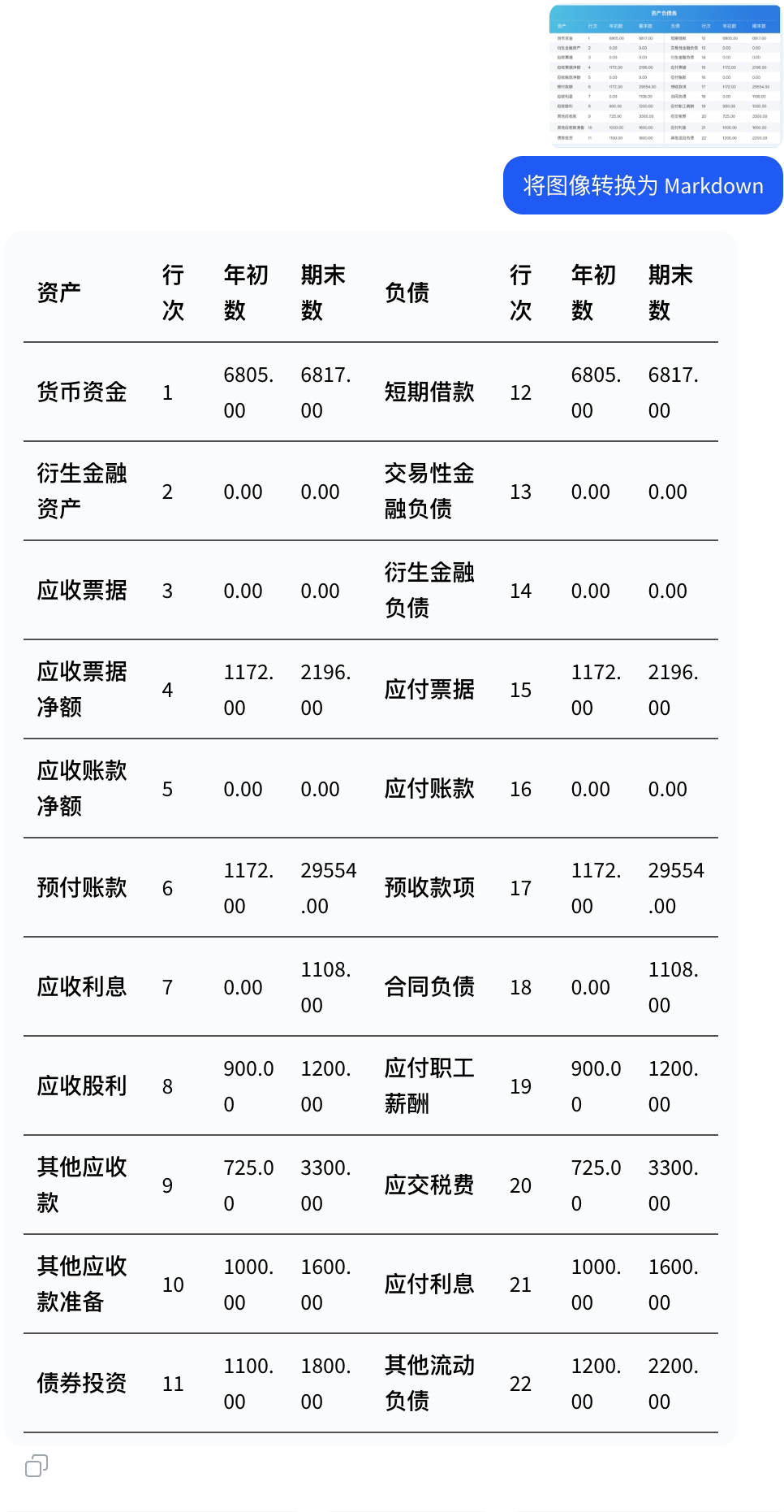 在实际测试中,我们将多张财报截图交由模型处理,并要求其转换为 Markdown 格式,输出结果与原始表格结构一致,能够满足日常文档处理需求。