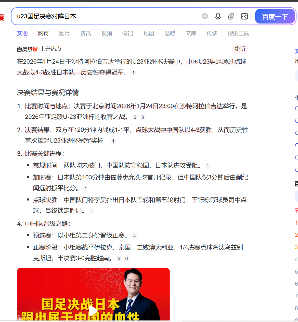 在2026年1月24日于沙特阿拉伯吉达举行的U23亚洲杯决赛中,中国U23男足通过点球大战以4-3战胜日本队,历史性夺得冠军。