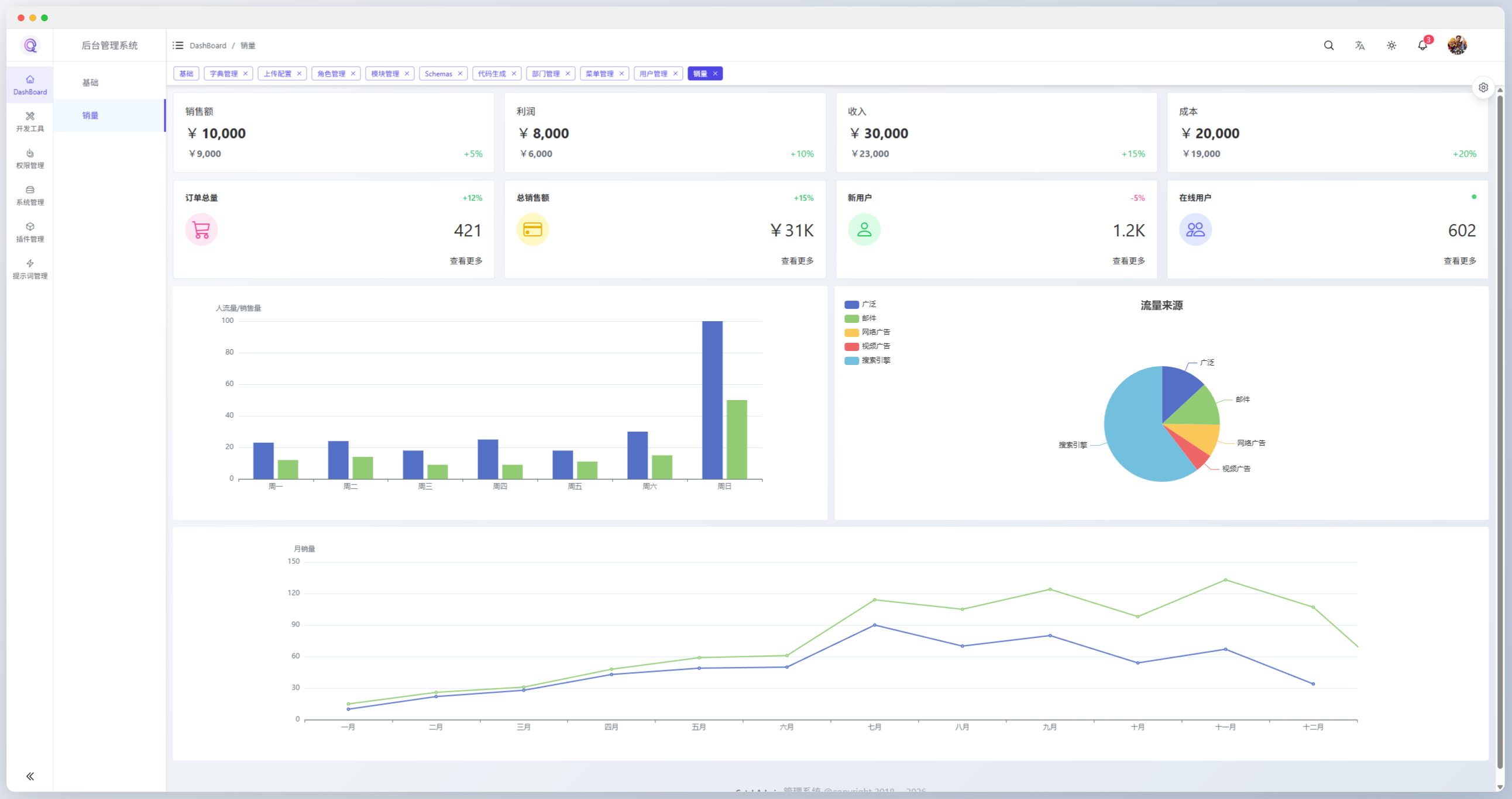 CatchAdmin 是一款基于 Laravel 12.x 与 Vue3 二次开发的 PHP 开源后台管理系统,采用前后端分离架构,面向企业级后台场景提供开箱即用的基础能力与可扩展的模块化框架。系统内置 Token 鉴权、权限管理(菜单/按钮/数据权限)、动态路由、动态表格、分页封装、资源权限控制、上传/下载、代码生成器(支持一键导入/导出)、数据回收站、附件管理等功能,覆盖后台系统从安全、权限到效率开发的常见需求。