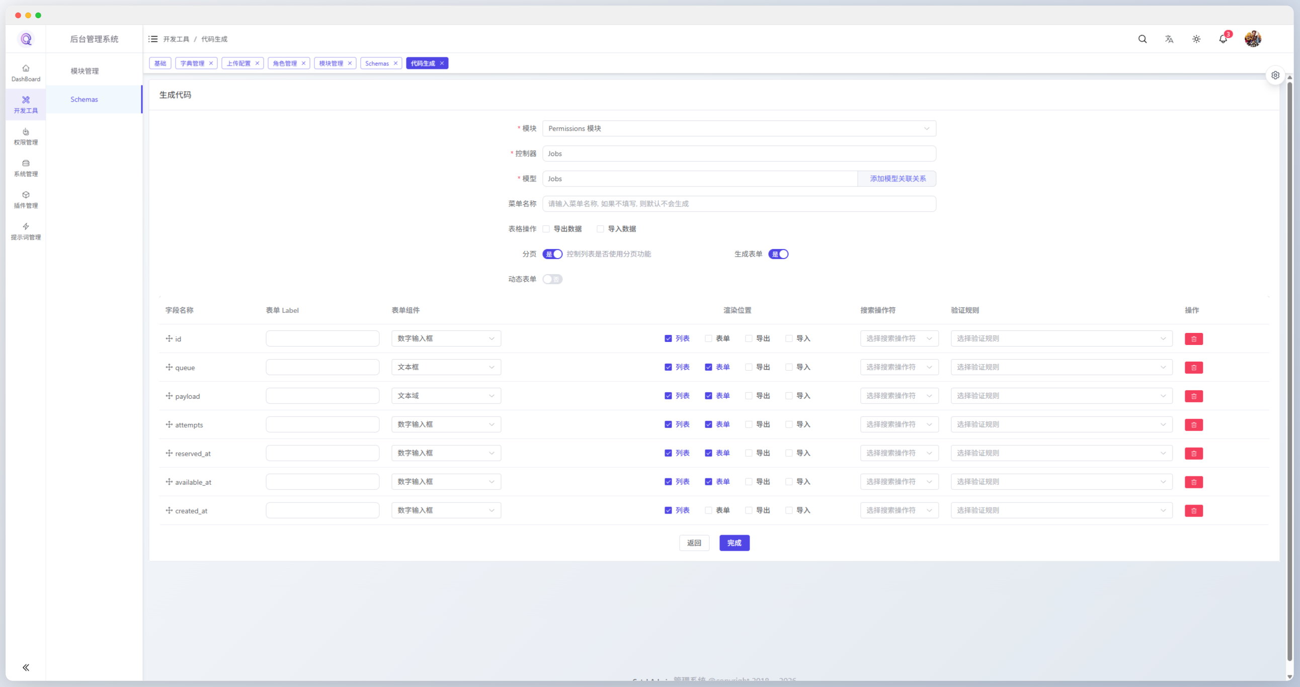 - ☑️ 代码生成:前后端代码生成(PHP、Vue、数据库迁移),支持一键生成到模块