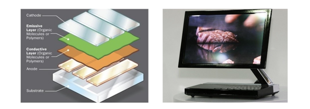 图1. 左:OLED结构;右:OLED应用于显示屏