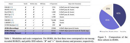 HORA数据集整合了超过15万条轨迹,融合了三类高质量数据源:真实场景RGB(D)录制数据、基于多视角动捕系统采集的带触觉信号数据以及公开HOI数据集后处理数据,形成了多源规模广泛与质量并重的数据体系。