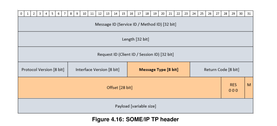 SOME/IP-TP header是在正常的SOME/IP协议报头后面加多了4 byte,前28bit是偏移值,还有三位保留值,置0,最后一位表示是否是最后一个分片(more fragment),如图: