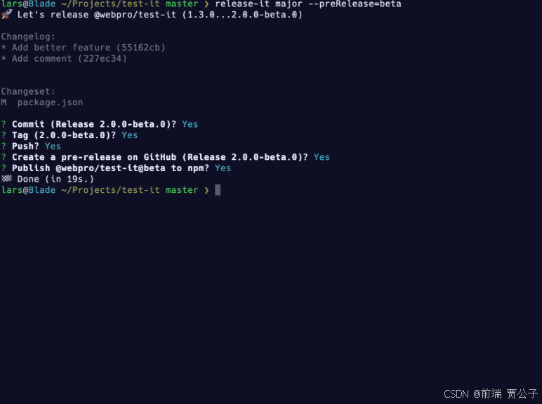 默认情况下,release-it 是交互式的,允许在执行之前确认每个任务: