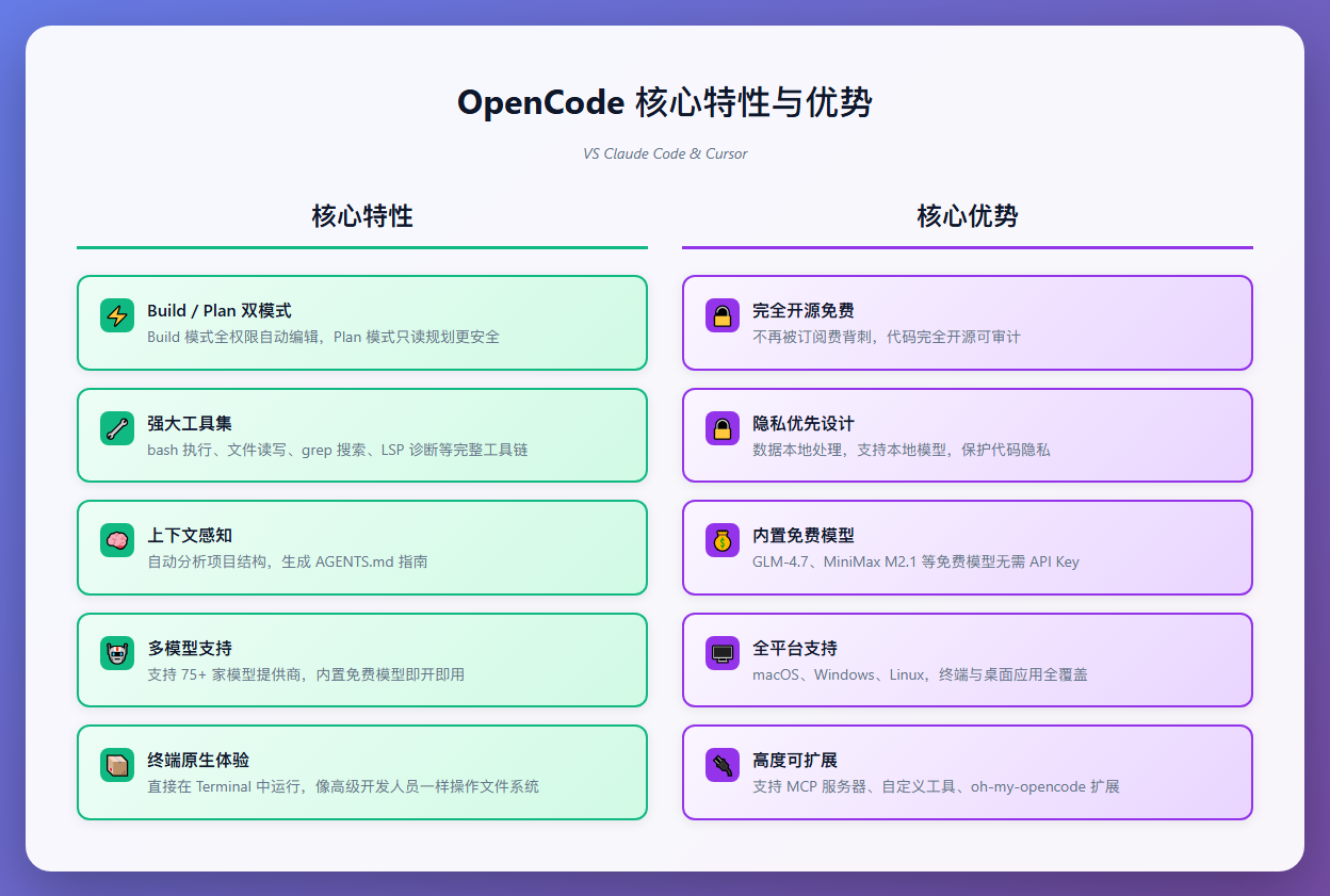 相比 Claude Code 和 Cursor 等商业化工具,OpenCode 的核心优势在于: