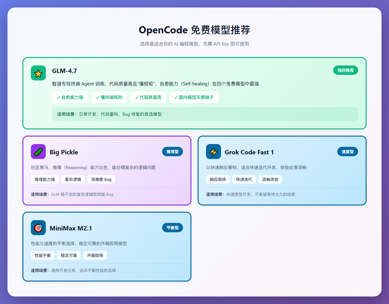 - 免费模型推荐:GLM-4.7(首选)、Big Pickle(推理强)、Grok Code Fast 1(速度快)、MiniMax M2.1(平衡型)