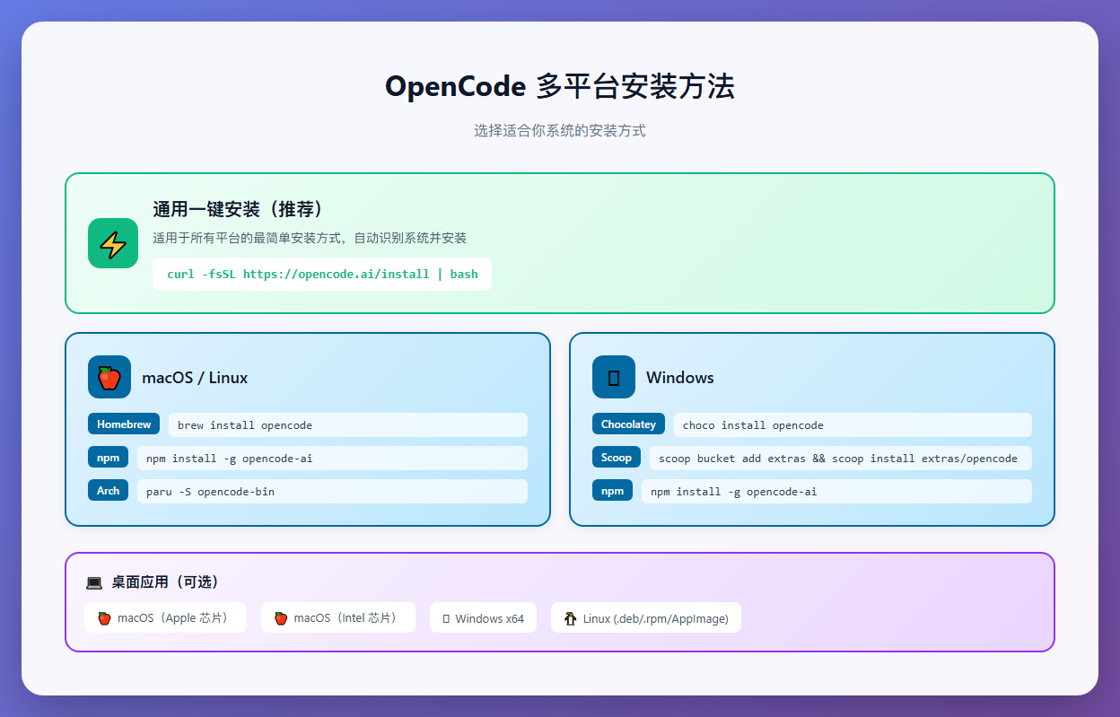 别慌,OpenCode 的安装非常简单,支持多种方式,选择最适合你系统的就行。