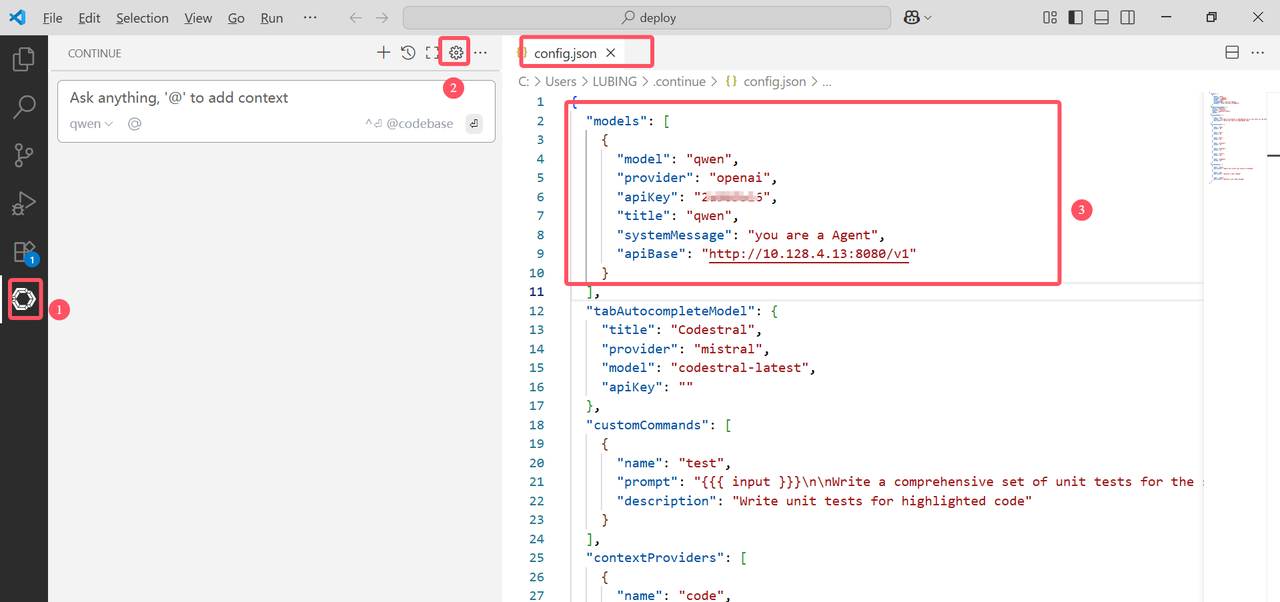 - 配置模型连接:按照图中顺序依次点击图标,会打开config.json配置文件。重点改以下红色框中的几个字段(参考OpenStation平台中模型服务信息进行修改):