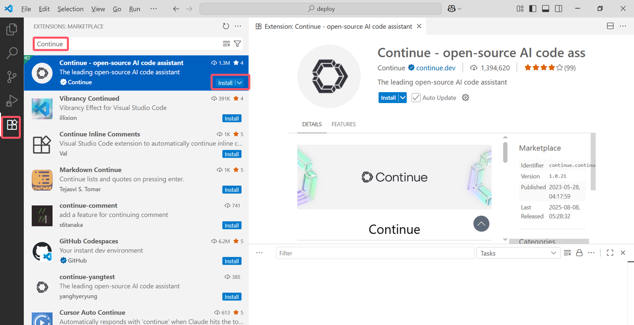 - 安装插件:在 VSCode 的扩展商店搜索 "Continue",点击安装。