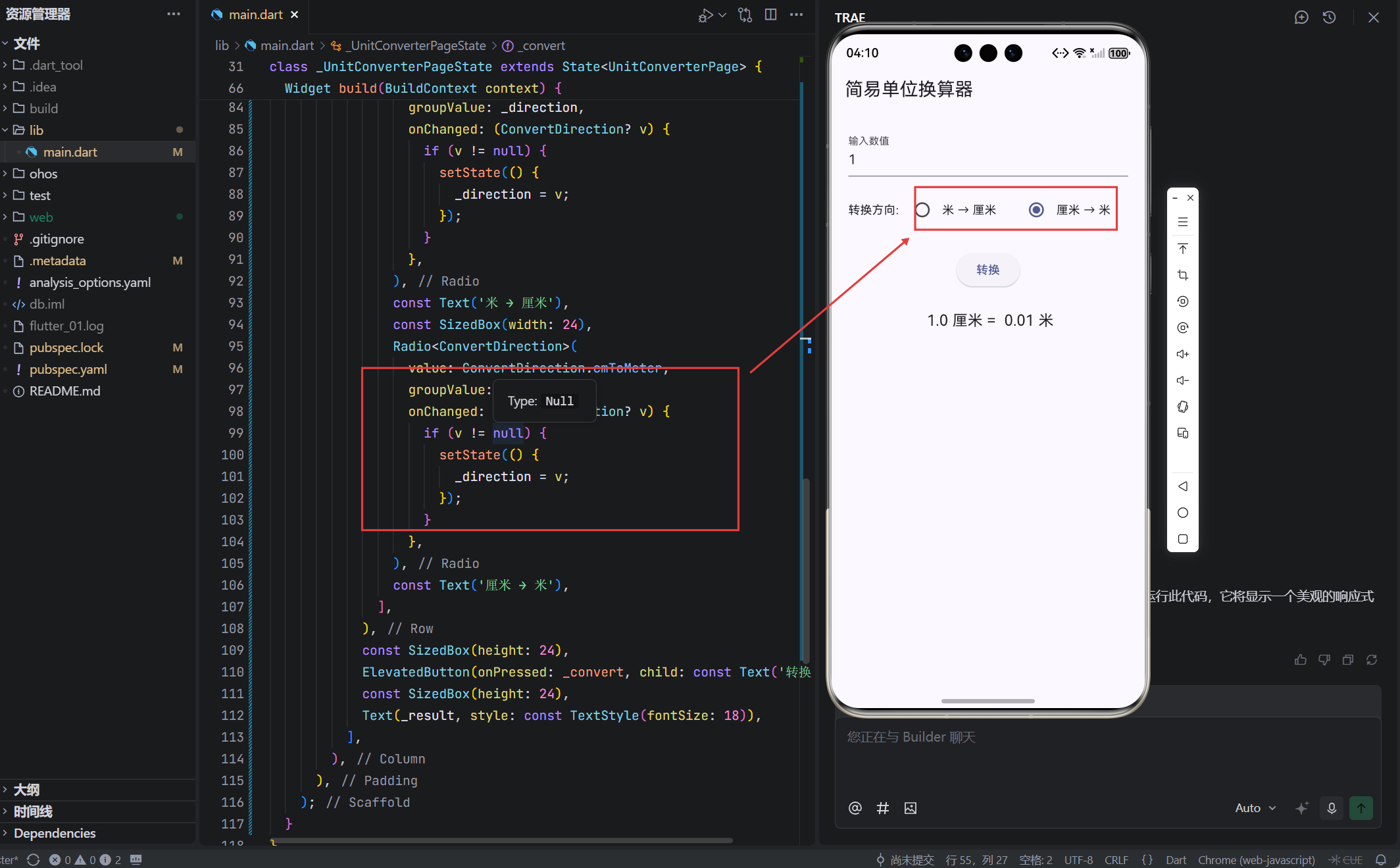${value},Dart 自动格式化浮点数; - 虽未处理精度(如 1.0 显示为 "1.0"),但对简易工具足够。