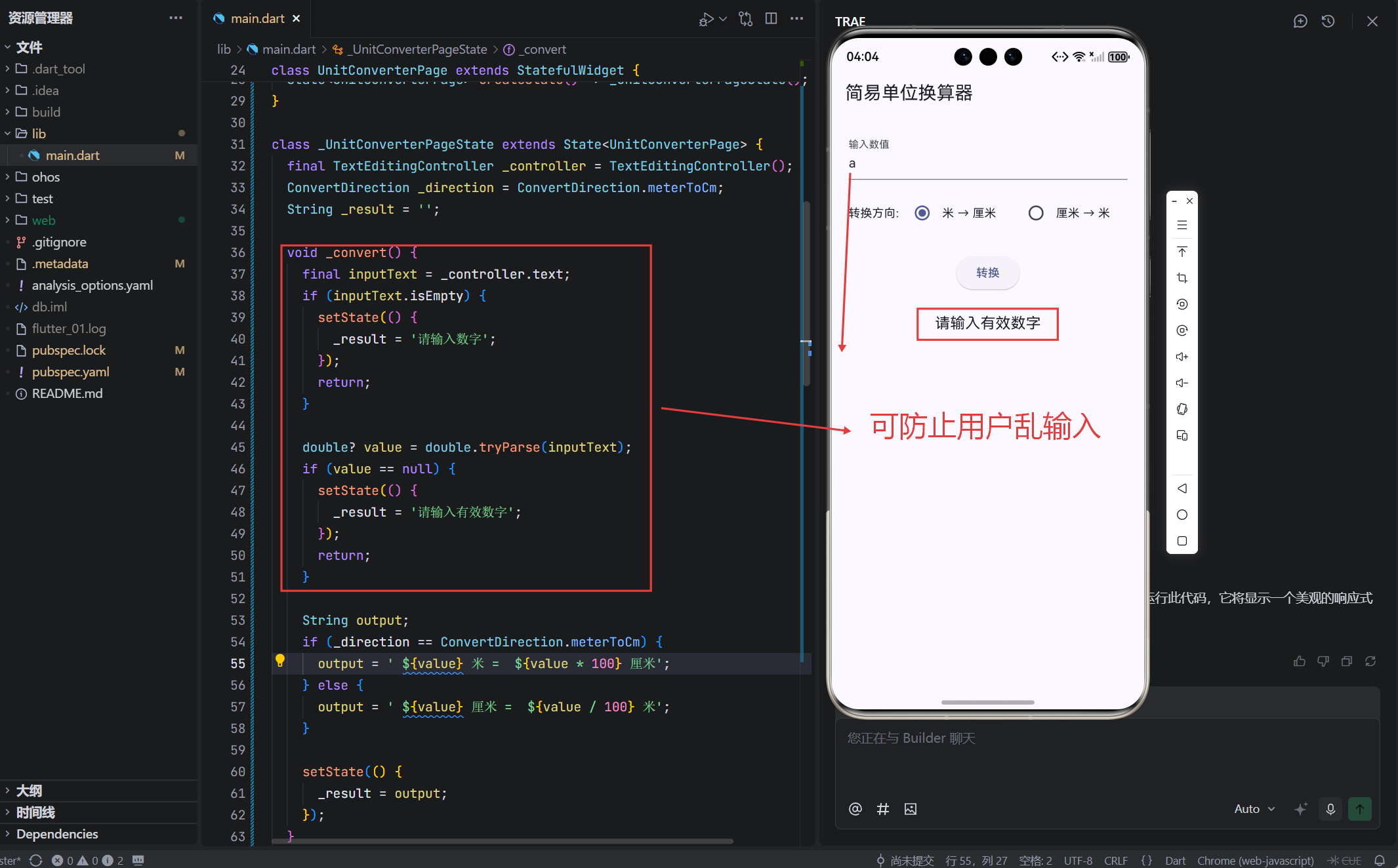 isEmpty,避免tryParse对空串返回null; double.tryParse:- 是 Dart 标准库方法,安全解析字符串为