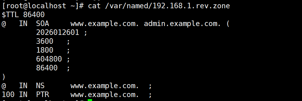 100 IN PTR www.example.com. # 反向解析核心记录(192.168.1.100 → www.example.com)