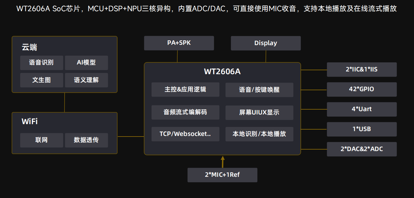 说起WT2606A,它的设计思路相当清晰:为离线与在线融合的语音交互提供一套高度集成的单芯片方案。这意味着,它不仅要具备优秀的音频编解码能力,能处理高质量的语音输入与音频输出,更要内嵌一颗够用的AI处理单元,来驾驭本地的语音识别与唤醒模型。你或许会问,如今云端算力如此强大,为何还要强调本地处理?实际上,这关乎响应速度、用户隐私,以及在网络不稳时的基础体验。WT2606A能让一些简单指令(如"暂停"、"下一首")在设备端瞬间完成,无需等待云端往返,这种"零延迟"的爽快感,恰恰是用户体验的微妙分野。