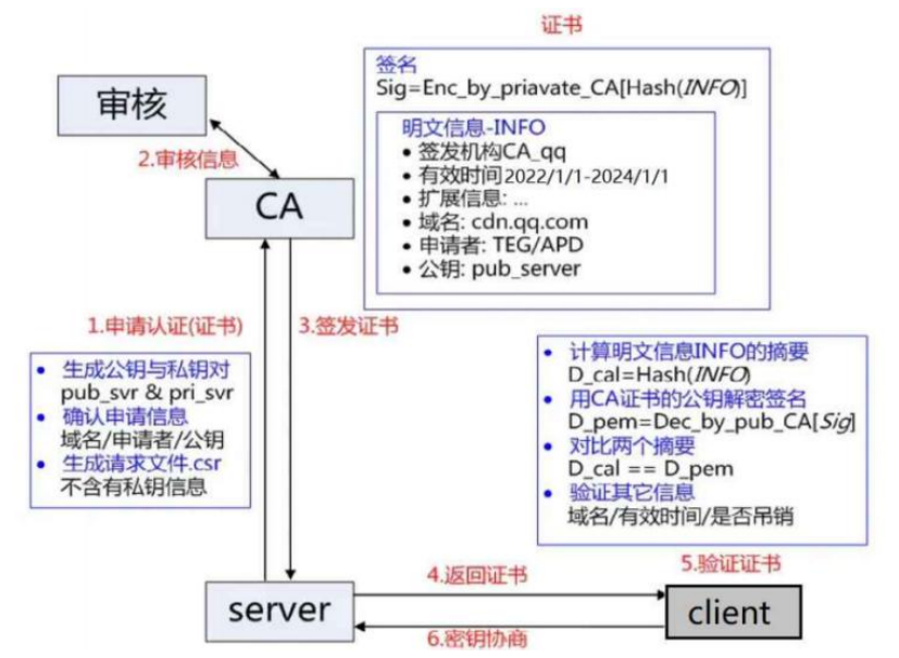 引入证书,CA认证:服务端在使用HTTPS前,需要向CA机构申领一份证书,证书里含有证书申请者信息、公钥信息等。服务器把证书传输给浏览器,浏览器从证书里获取服务器的公钥就行了,证书就如身份证,证明服务端公钥的权威性。