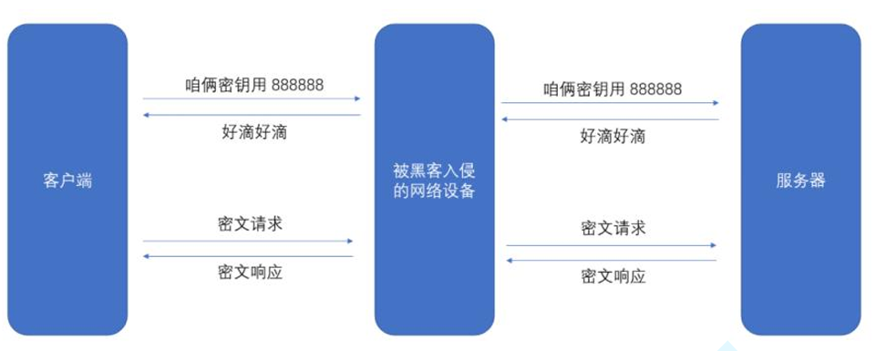 但事情没这么简单,对称加密的密钥必须严格保密,但如果通信双方不在同一物理环境下,密钥就需要通过网络传输给对方。而传输过程中没有更安全的加密手段保护密钥本身,密钥只能以明文的方式传递,极易被中间人劫持。如下图所示: