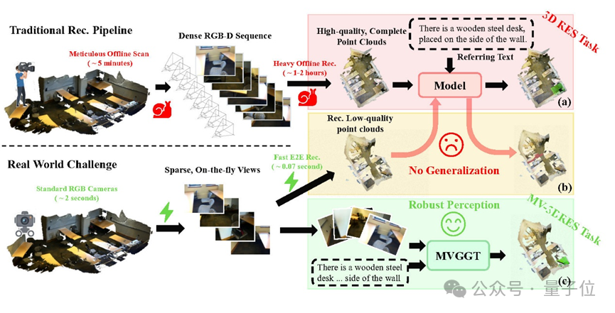 厦门大学、字节跳动等团队提出的MVGGT模型,正是为应对这一真实困境而生。该工作定义了"多视图3D指代表达分割"新任务,并设计了一种双分支Transformer架构,结合创新的优化策略,让机器人仅依靠稀疏的多视角图片和文本指令,就能联合重建场景并精确分割出目标物体。这意味着机器人的三维感知能力向真实、可用迈进了一大步,为在家庭、仓库等非结构化环境中完成"拿取那个白色杯子"这类任务,提供了更扎实的技术基础。