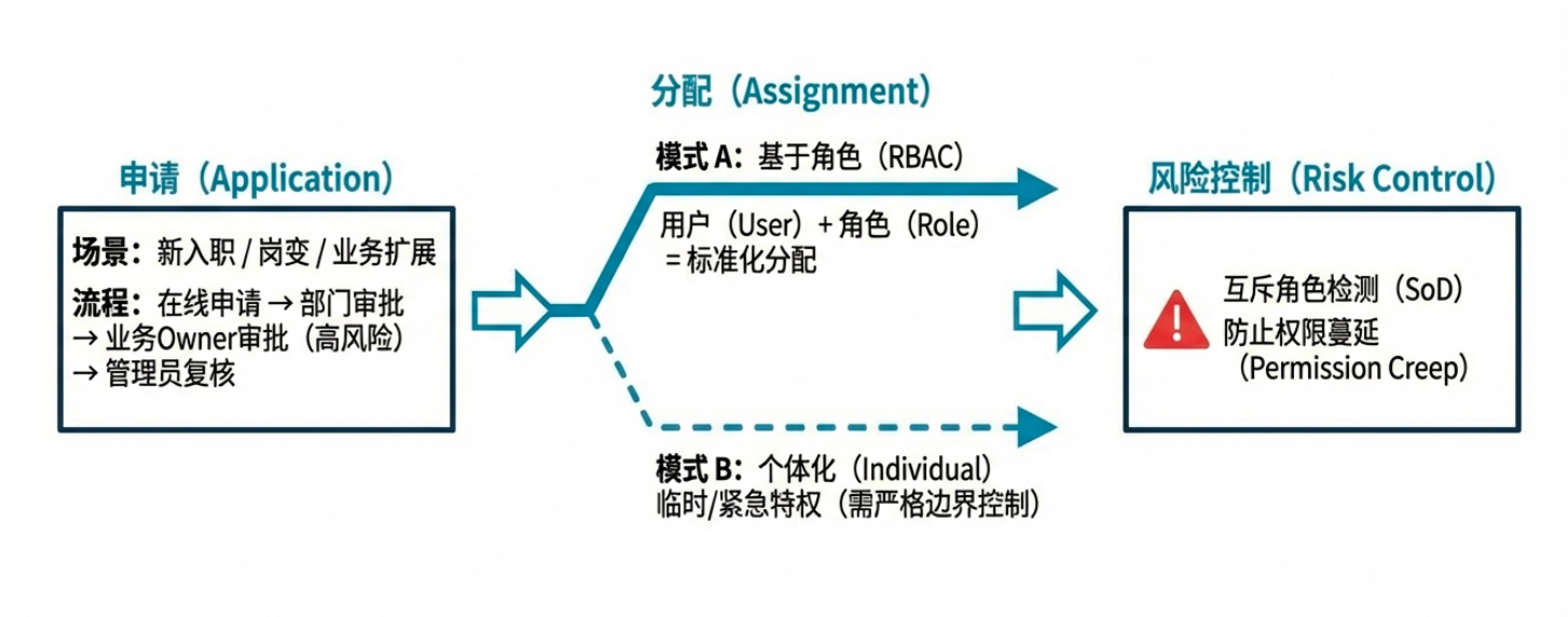 权限分配: 标准化赋予,基于⻆⾊或规则批量分配。