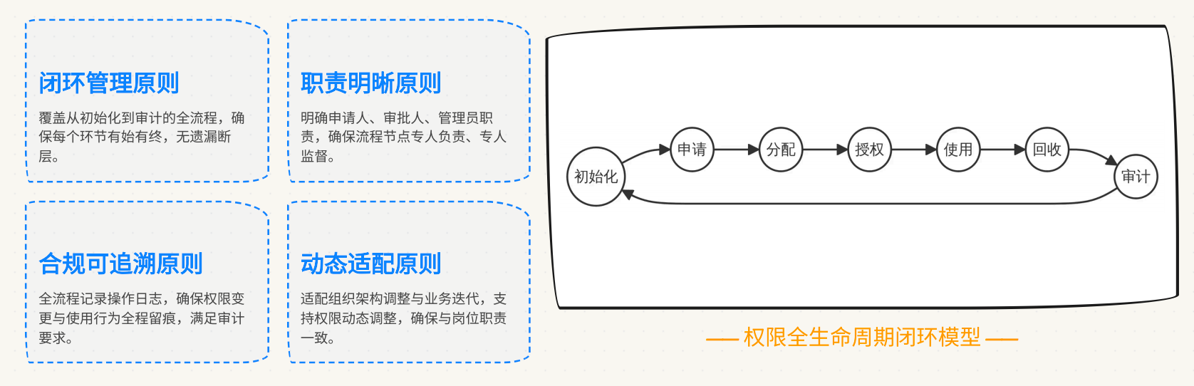 **可管控:**建⽴全⽣命周期权限管理机制,实现权限从初始化到回收的闭环管理,提升权限运营效