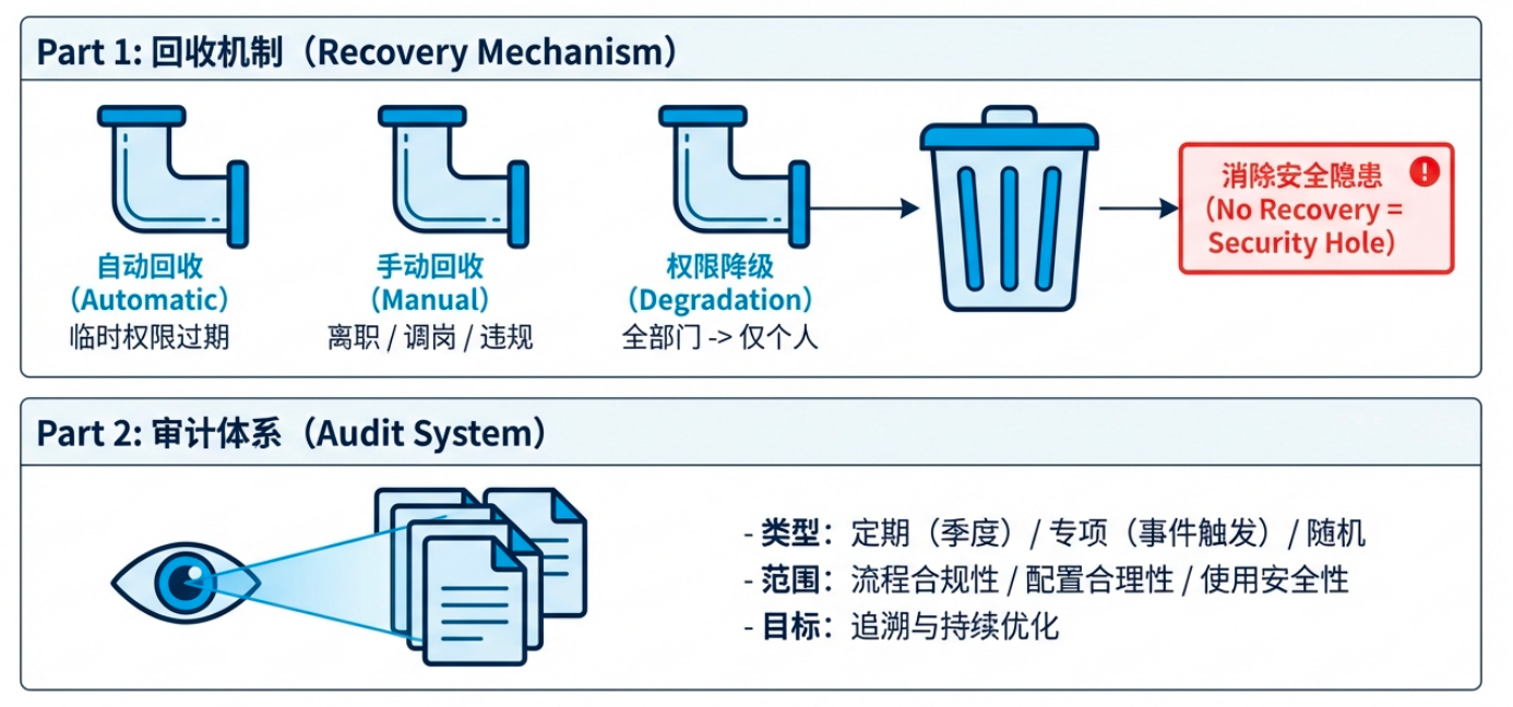 权限回收:闭环收尾,⽀持⾃动、⼿动、降级三种⽅式。