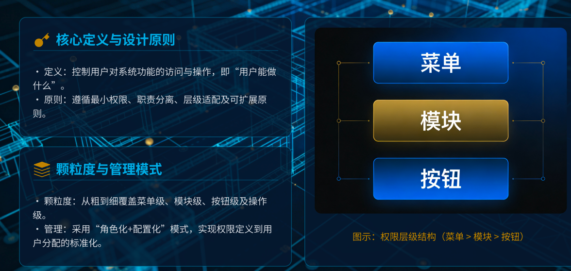 功能权限的颗粒度直接决定管控精度,需结合企业业务复杂度、组织架构层级、风险等级设计分级颗粒