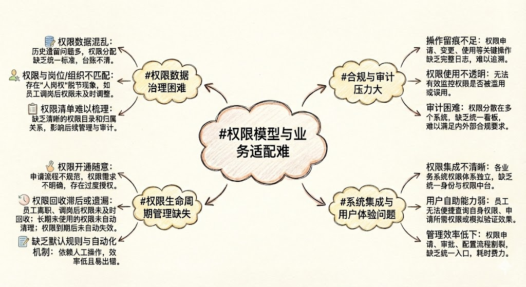 具体可归结为 :适配难、数据乱、回收慢、留痕弱、审计难、集成散。因此,需要从统一权限模型、建立权限台账...等方向系统性推进