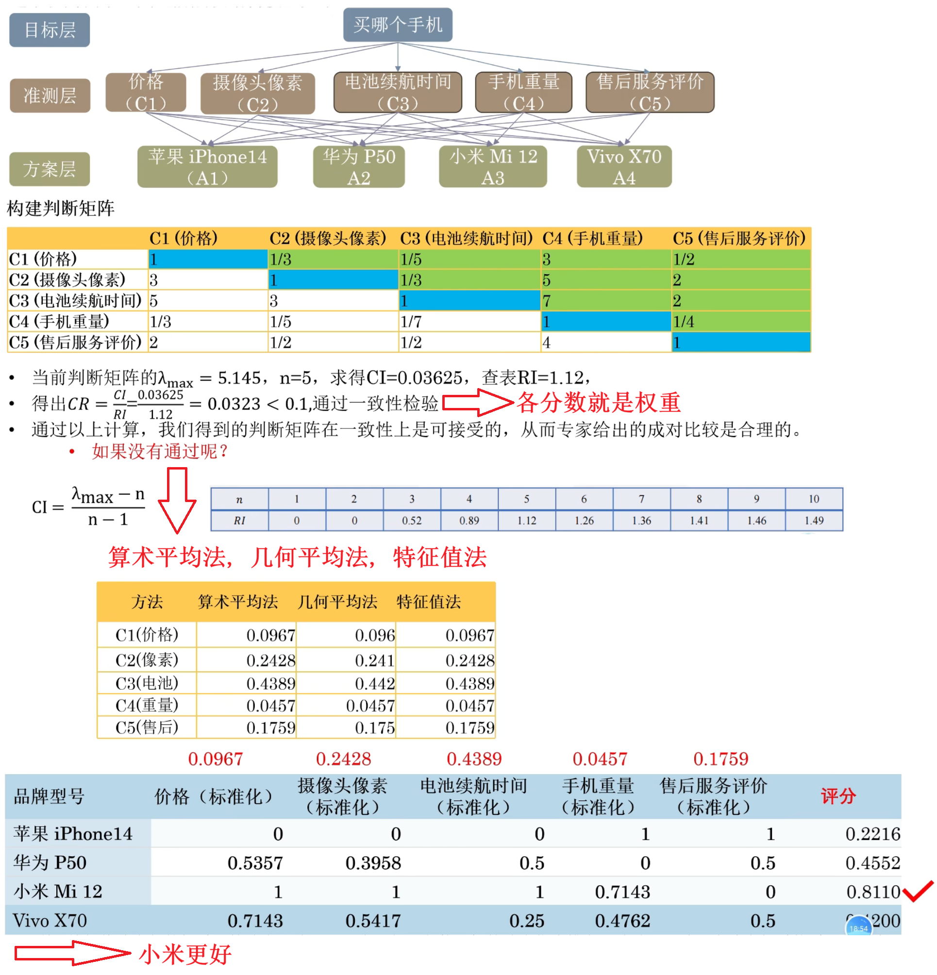 若正互反矩阵A的最大特征值 λ m a x > n \lambda_{max}>n λmax>n, 则需要一致性检验(判断该矩阵的一致性是否在接受范围内)